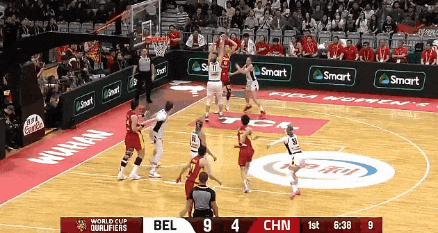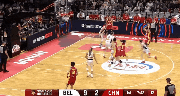 第一节比赛中,李月汝上篮打进、张曼曼三分投进,中国女篮7-9落后比利时。