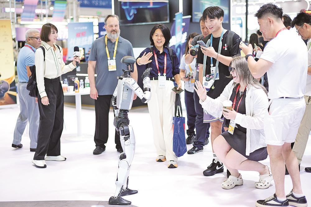 14日,观众在第六届消博会科技消费展区与宇树机器人互动。