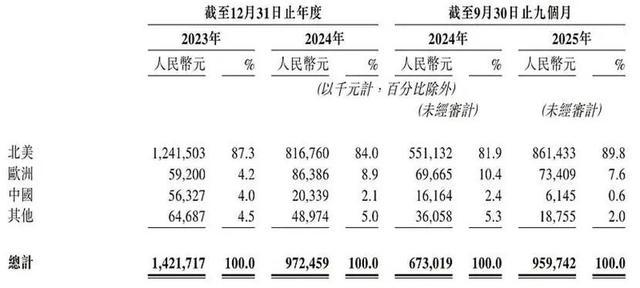 值得关注的是,数据显示,中鑫家居海外收入占比2023年~2025年前9个月占比分别高达96.%、97.9%、99.4%,其中,2025年美国市场占比达81.2%,高度依赖单一市场经营。
