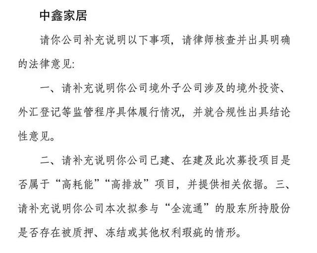 根据证监会要求,第一,要求律师核查中鑫家居境外子公司涉及的境外投资,外汇登记等监管程序履行情况,并就合规性出具意见;第二,需补充说明公司已建、在建及此次募投项目是否属于“高能耗、高排放”项目,并提供相关依据。第三,补充说明本次你参与“全流通”的股东所持股份是否存在被质押、冻结或其他权利瑕疵的情形。