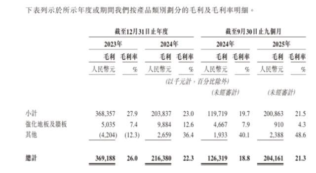 根据招股书,中鑫家居2023年、2024年及2025年前9个月,公司营业收入分别为14.22亿元、9.72亿元、9.6亿元;2023年录得净利润1.25亿元,2024年净利润大幅下滑至5270亿元,跌幅达57.9%,2025年前三季度净利润回升至7410万元。公司毛利率从2023年的26%下滑至2024年的22.3%,2025年前9个月进一步下滑至21.3%,3年累计下降4.7%。