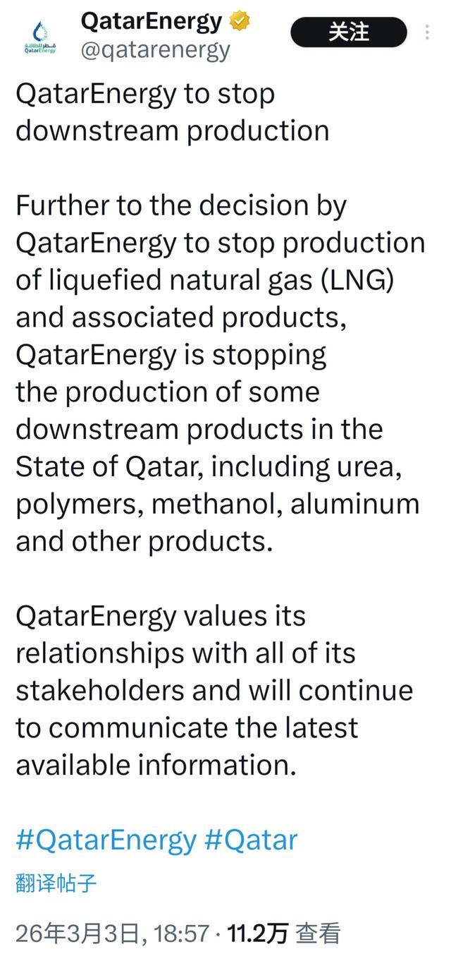 3月3日,卡塔尔能源公司发表声明称,继决定停止生产液化天然气(LNG)及相关产品后,该公司还将停止在卡塔尔国内生产的一些下游产品,包括尿素、聚合物、甲醇、铝及其他产品。