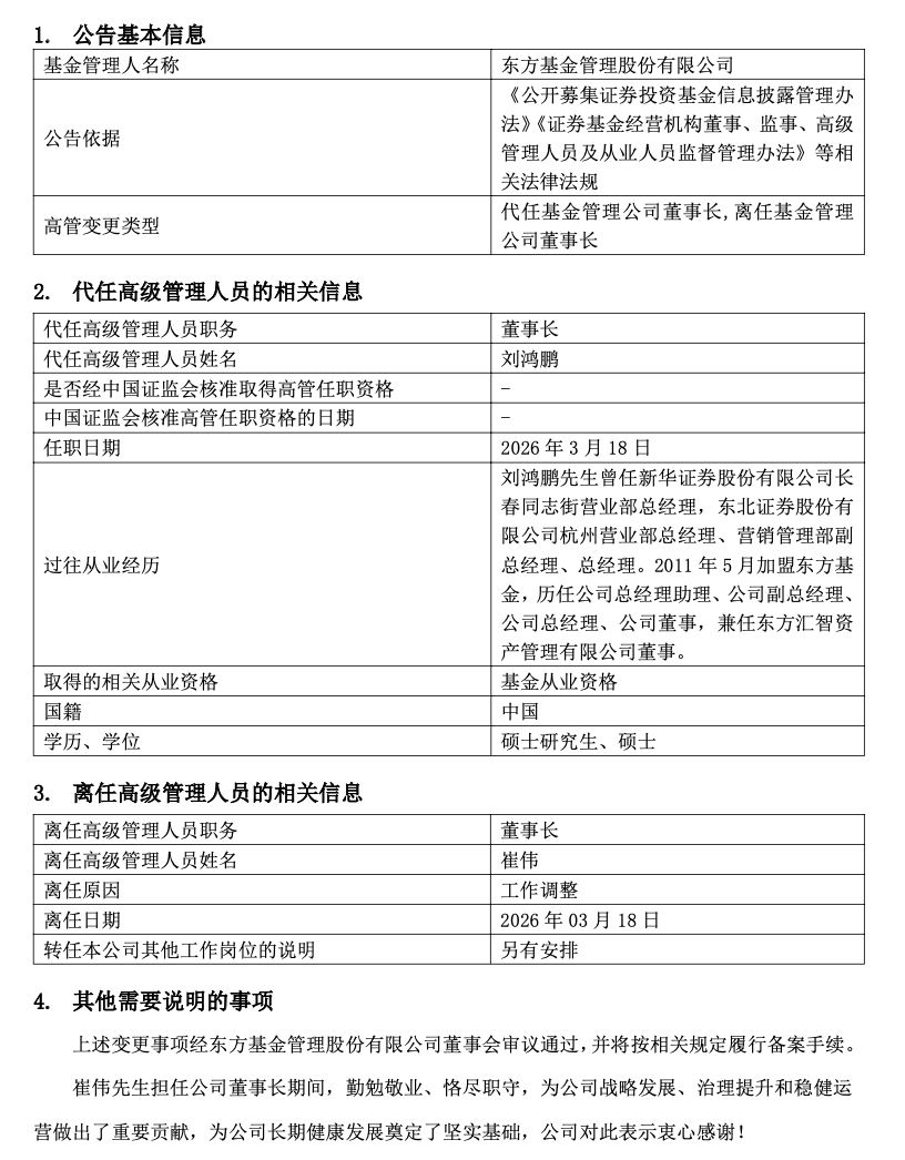 3月20日,东方基金管理股份有限公司(下称“东方基金”)公告称,自3月18日起,因工作调整,崔伟离任公司董事长职务,由公司总经理刘鸿鹏代任董事长。公告中,对于崔伟转任公司其他工作岗位的说明为“另有安排”。