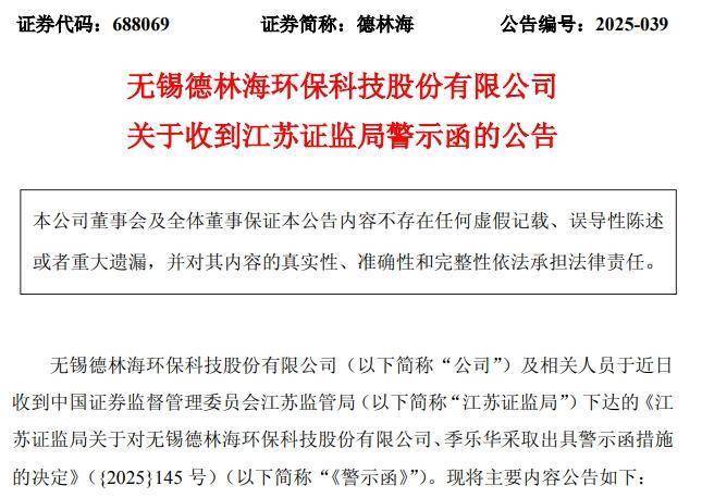江苏证监局指出,公司上述行为违反了相关规定。季乐华作为时任财务负责人,未能勤勉尽责,对上述行为负有主要责任,违反了相关规定。根据规定,该局决定对德林海及季乐华采取出具警示函的行政监管措施,并记入证券期货市场诚信档案。